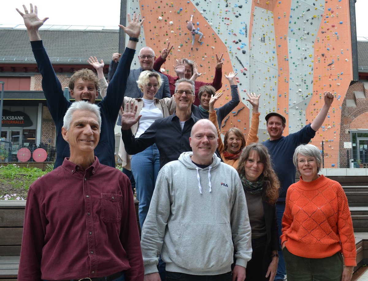 Zum Abschluss unseres Treffens machen wir noch ein gemeinsames Foto vor der Kletterwand an der Waggonhalle: Wir wissen, dass uns ein steiler Anstieg bevorsteht, ein Kraftakt ungekannten Ausmaßes. Was uns oben erwartet, ist nicht ganz abzusehen. Doch wenn wir umsichtig sind und einen Schritt nach dem anderen tun, dann können wir gemeinsam etwas erreichen, was noch keiner vor uns geschafft hat: Ein erfolgreiches Volksbegehren in Hessen, dass die direkte Demokratie in den Kommunen stärkt und ein deutliches Signal an die Landesregierung sendet: Wer Beteiligungsrechte abbaut, weckt den hessischen Löwen!